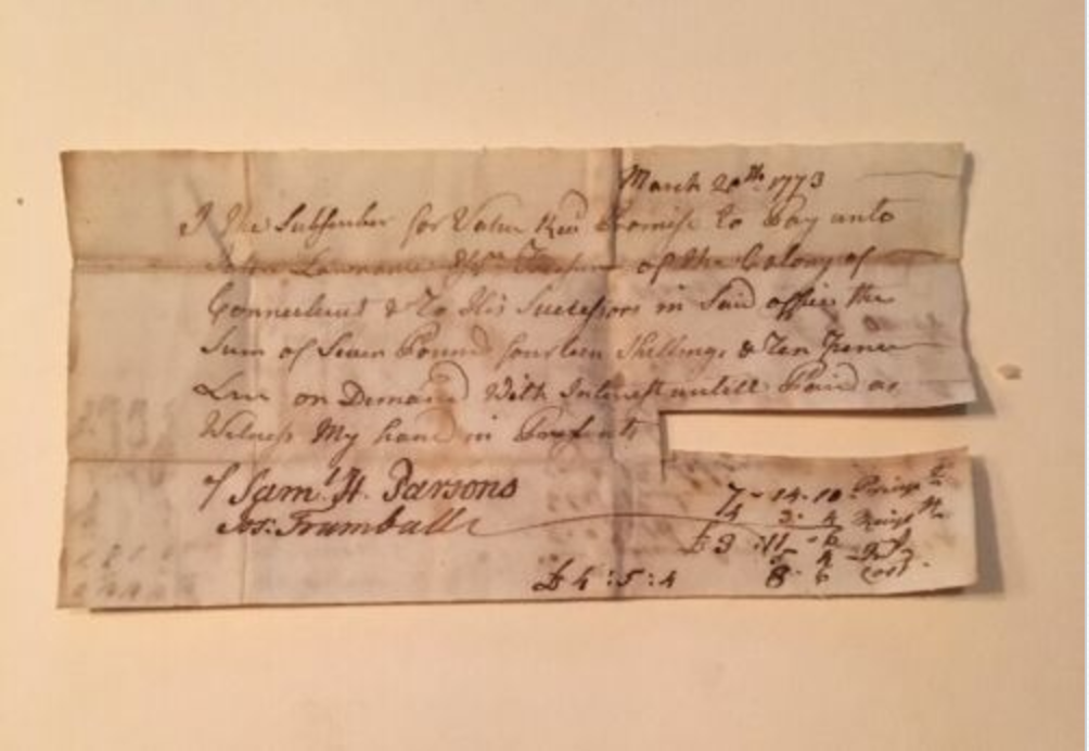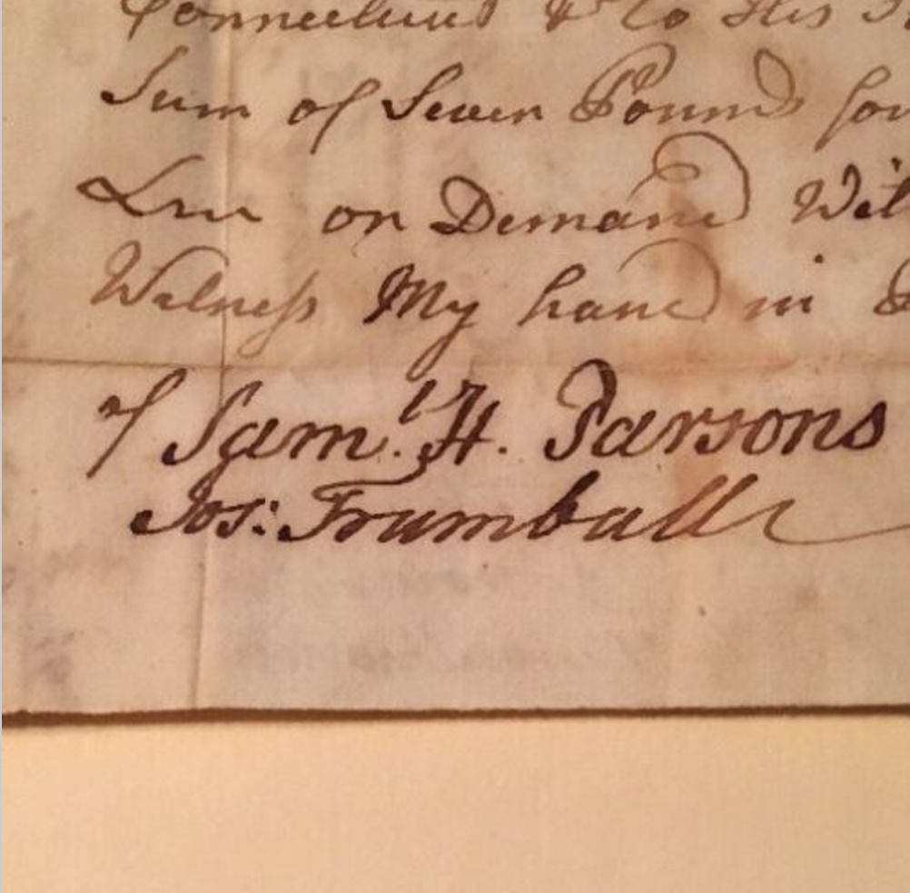 This a rare 1773 Revolutionary War signed document by Major General Sam H. Parsons of the Continental Army. His ink signature is clean on this Promissory Note dated on March 20, 1773. It is also signed by Joseph Trumbull, son of Jon Trumbull, First Governor of Connecticut. This note comes out of the Lawson Estate in Union CT.
