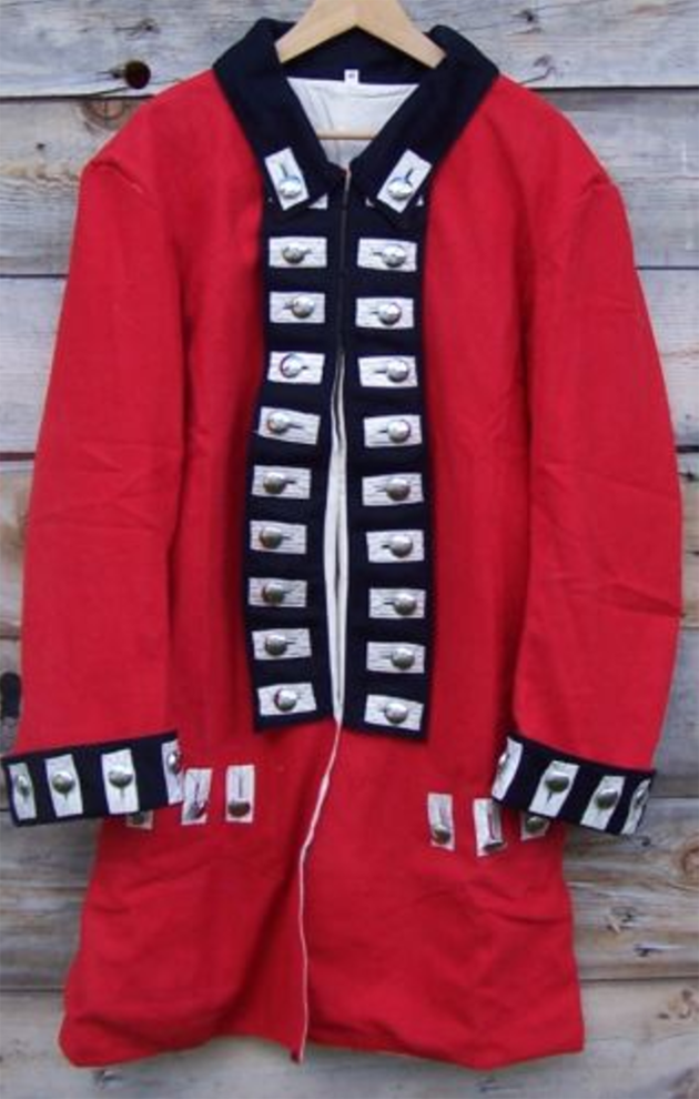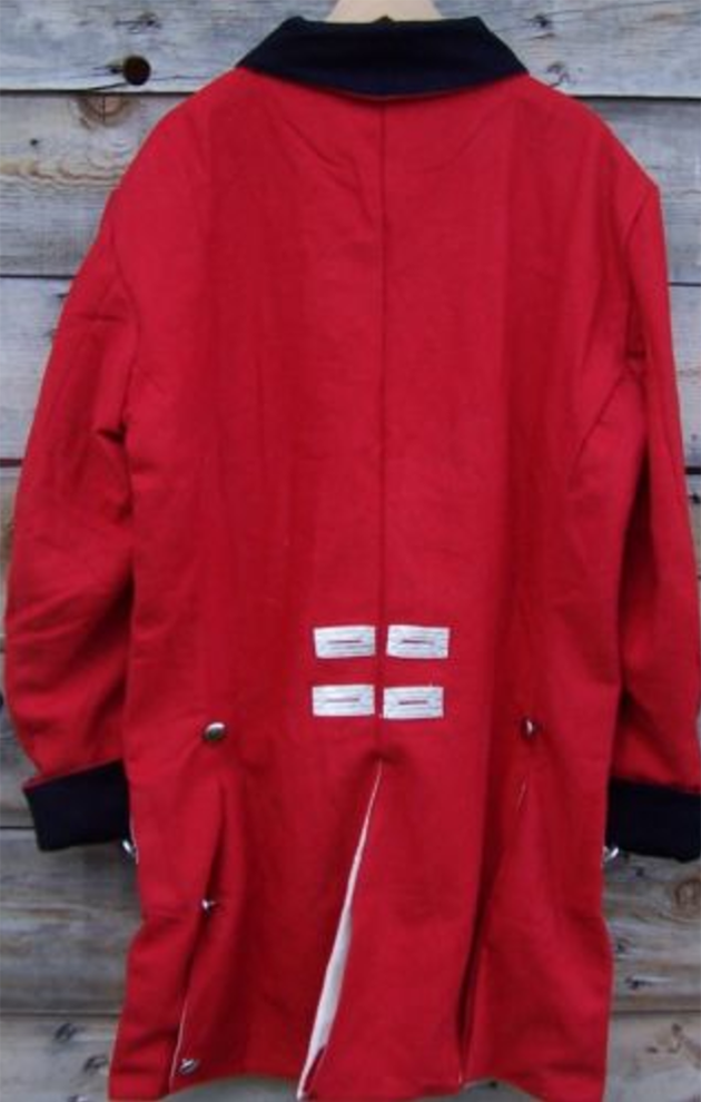 This British Army regimental frock coat is made with 100% heavy wool and fully lined with linen. It features four domed silver buttons on each sleeve, 20 buttons on the front, and 2 buttons on the back. Hook and Eye hooks keep the coat closed across the chest, and lapel can be turned over and secured across the chest with domed silver buttons for colder weather.
