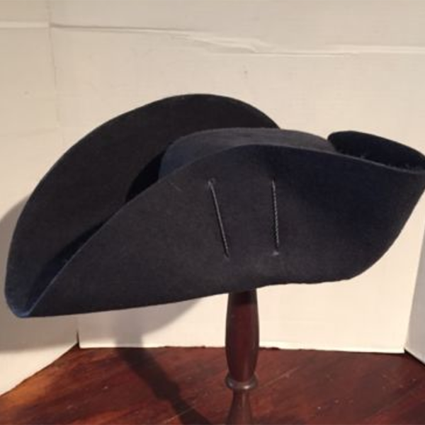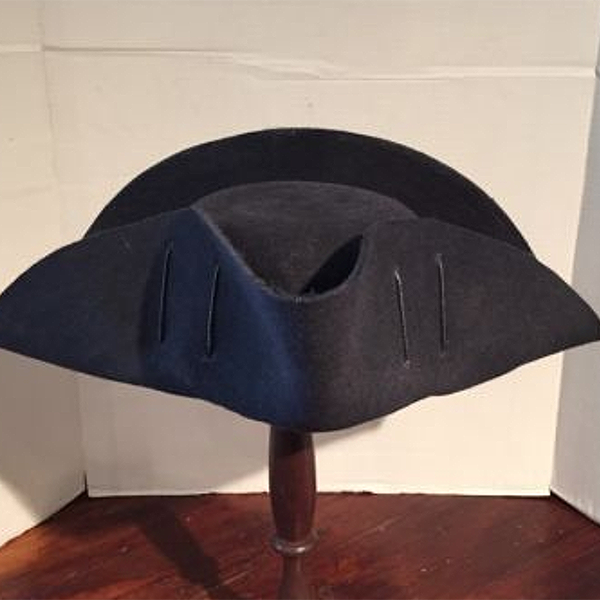 Handcrafted in the USA, this 1770-1783 era recreated wool felt unbound cocked hat was worn by soldiers, sailors, and civilians. This hat features a round blocked crown and adjustable natural linen liner. Gently used, like new.